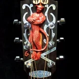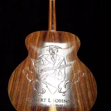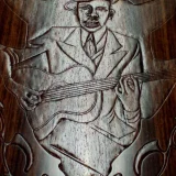 The carving of Robert Johnson on the back of this guitar is his likeness based on one of the surviving photographs.