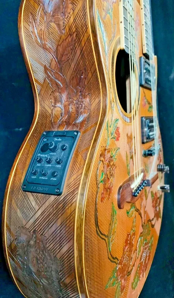 We can carve and inlay names, phrases and initials and we can even carve and inlay designs, faces and scenes from your photographs. Basically, if you can think of it we can get it onto your instrument.