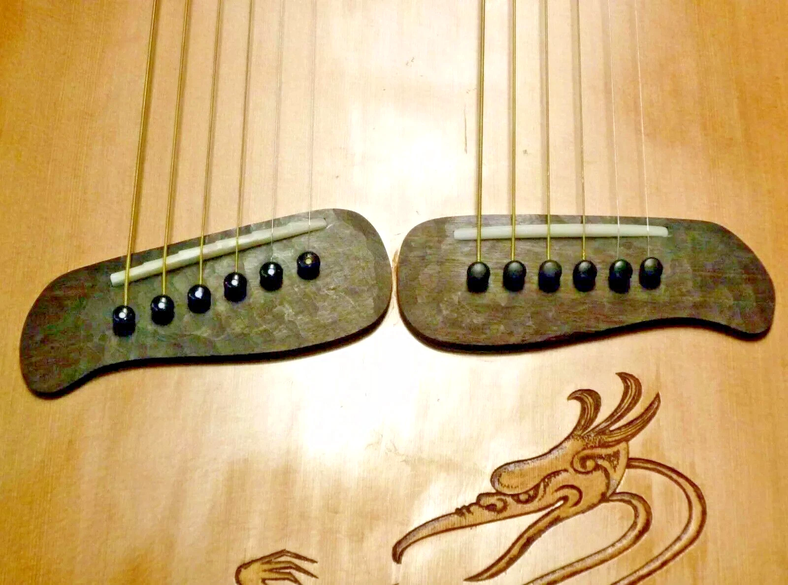 We can carve and inlay names, phrases and initials and we can even carve and inlay designs, faces and scenes from your photographs. Basically, if you can think of it we can get it onto your instrument.