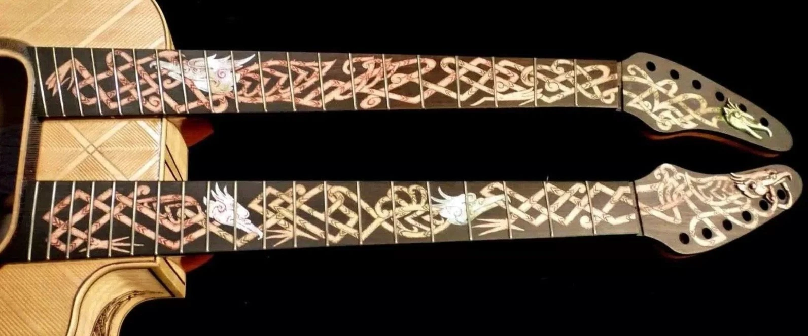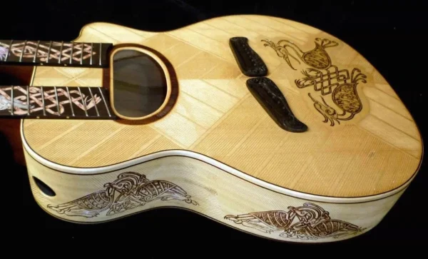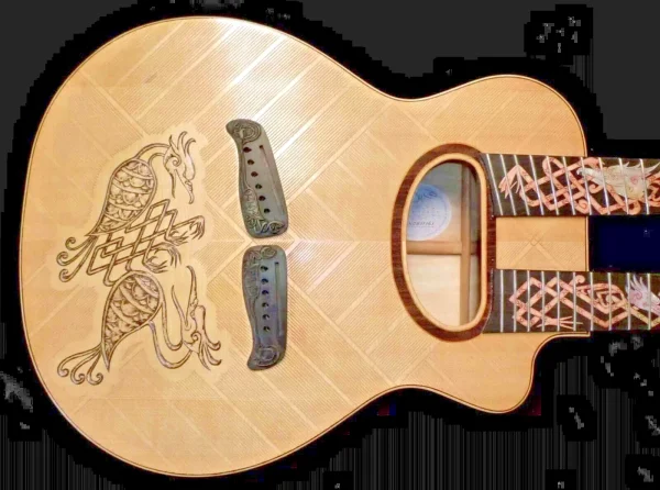 We can carve and inlay names, phrases and initials and we can even carve and inlay designs, faces and scenes from your photographs. Basically, if you can think of it we can get it onto your instrument.