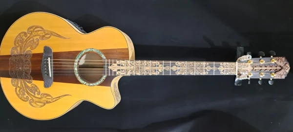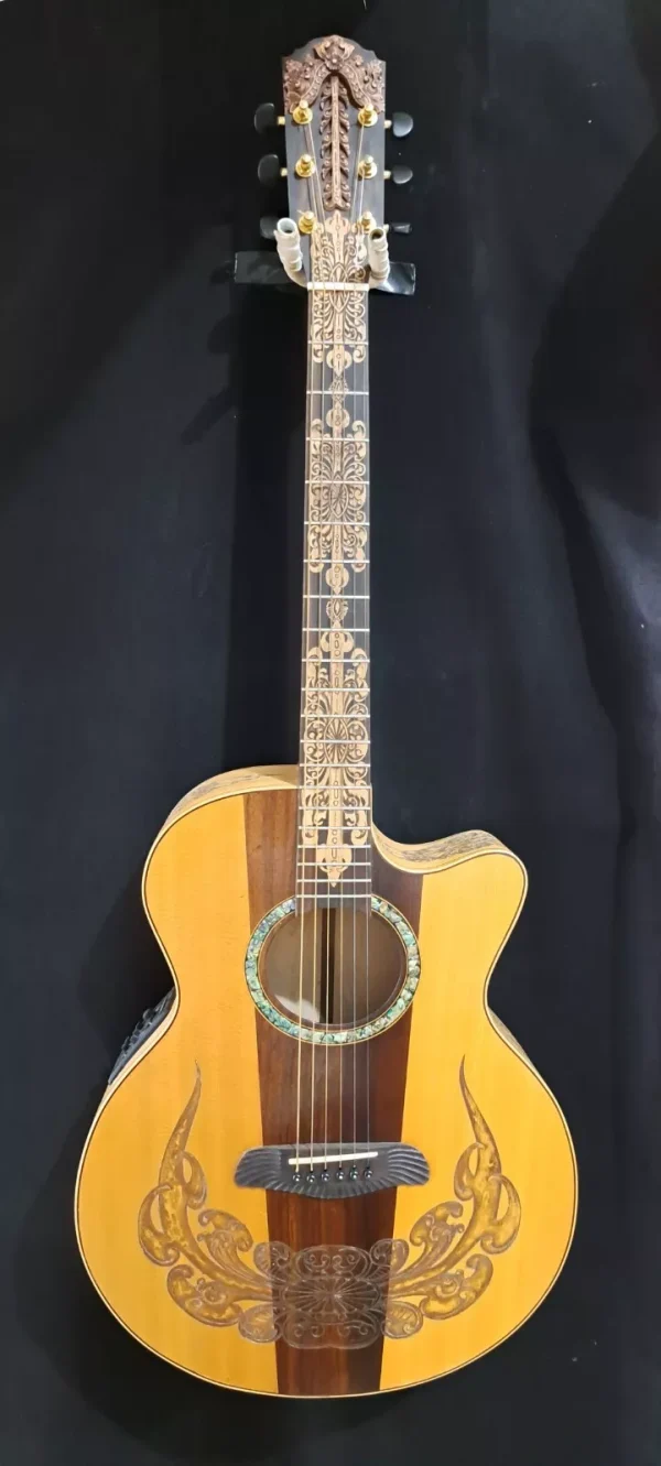 We can carve and inlay names, phrases and initials and we can even carve and inlay designs, faces and scenes from your photographs. Basically, if you can think of it we can get it onto your instrument.